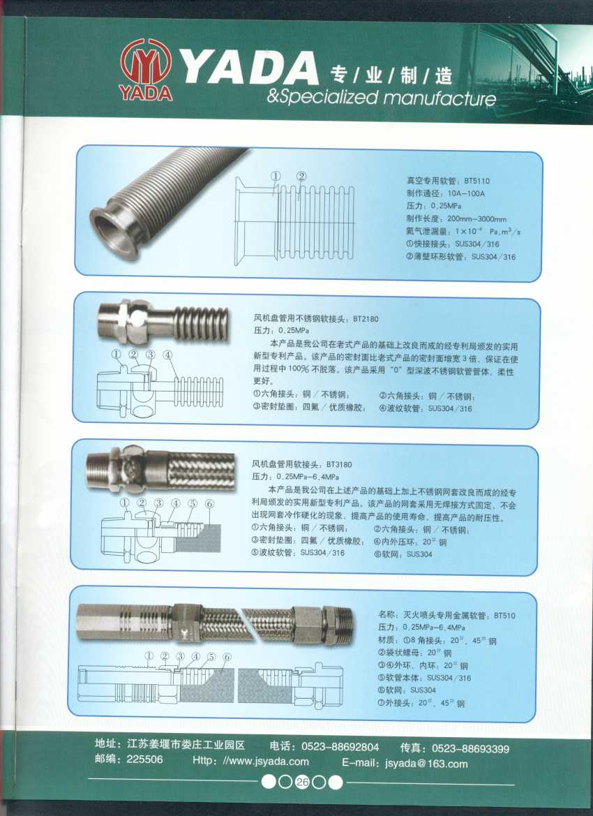 秉天時(shí) 籍地利 仰人和 虔誠一個(gè)永恒的理念,創(chuàng)新永續(xù).百諾不如一信,亞達(dá)人堅(jiān)持以信為本,視客戶如同上帝,把對信譽(yù)的追求,體現(xiàn)在嚴(yán)格的質(zhì)量控制和完善的客戶服務(wù)上,讓客戶百分之百滿意是亞達(dá)人不變的信念。 本廠系ISO9001質(zhì)量認(rèn)證企業(yè)、計(jì)量合格企業(yè)。本廠專業(yè)致力于生產(chǎn)不銹鋼金屬波紋軟管、超高壓、高壓膠管、波紋管補(bǔ)償器(膨脹節(jié))、立式、臥式、冷卻器。本廠產(chǎn)品具有承受壓力高、彎曲半徑小、抗疲勞性能強(qiáng)、使用壽命長等特點(diǎn)。廣泛應(yīng)用于電力、石化、冶金、水泥建材、工程機(jī)械、礦山及液壓系統(tǒng)。產(chǎn)品暢銷全國各地。 今日亞達(dá)之成功源自諸多客戶的厚愛,明天的輝煌更離不開您對我的支持與信賴。查看更多>>